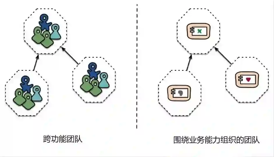 微服务架构风格则采用围绕业务线进行划分的方式,以保证一个团队中能拥有UI工程师、开发工程师、DBA和项目经理。实施微服务后的组织结构如图1-7所示。