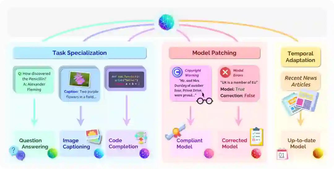 局部模型编辑。 在某些情况下,对基础模型进行局部的调整很有价值,局部调整是指模型的预测分布应该仅针对单个输入或单个输入周围的局部邻域进行调整,而不改变模型对不相关的输入的反应。例如,当基础模型对特定输入短语和目标语言产生特别有问题的误译时,希望在不影响模型对不相关短语的反应的情况下纠正这种误译。过去的工作研究了通过新的预训练目标将近似局部更新应用于大型神经网络的问题,这些目标可以轻松地使用标准梯度下降 [Sinitsin et al. 2020] 、可以预测底层模型的参数编辑方式的高阶网络 [Cao et al. 2021] 以及约束微调程序[Zhu et al. 2020] 等方式对模型进行编辑。然而,现有方法在执行模型编辑而不损害模型的全局性能可靠性方面存在差异。此外,由于所需要计算的高阶梯度 [Sinitsin et al. 2020; Cao et al. 2021] 的规模和训练目标的计算成本较大,将这些方法扩展到大规模基础模型存在一定的困难。