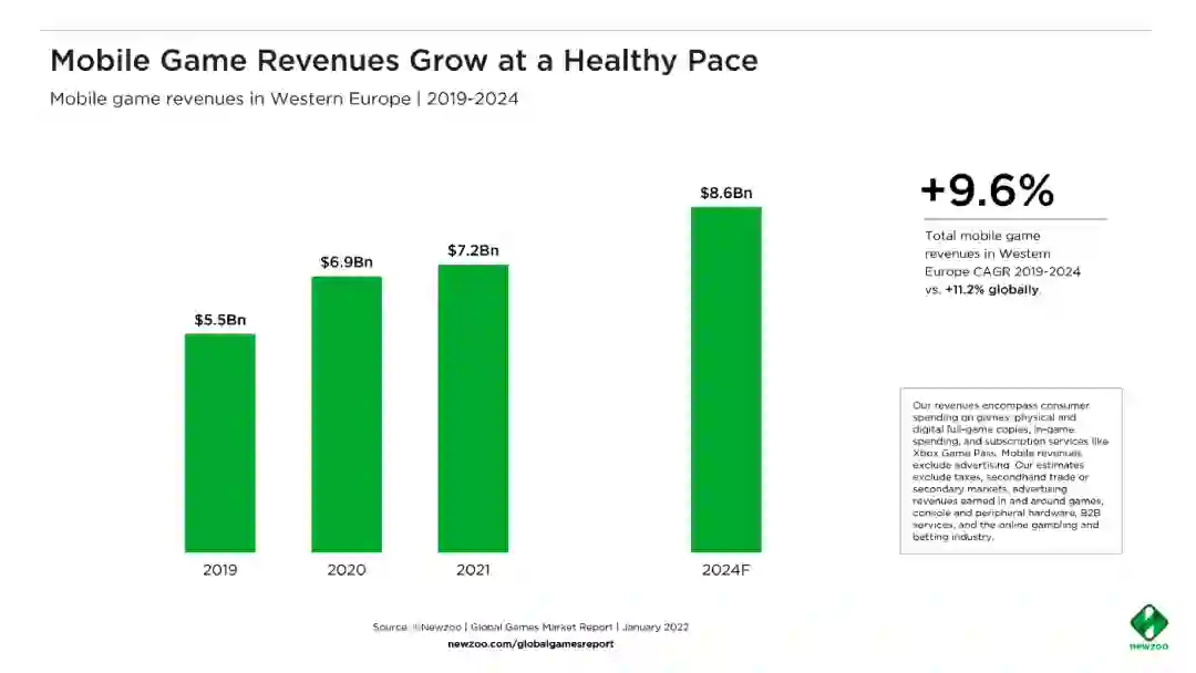 长远来看,西欧地区的手游市场将实现进一步增长,预计到 2024 年达到 86 亿美元