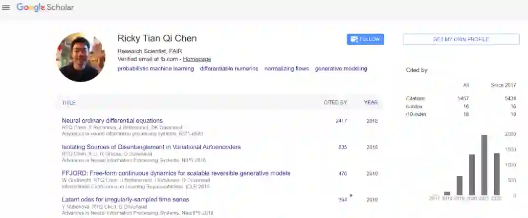 第二作者陈天琦是多伦多大学博士,现在是 Meta AI 的研究科学家。2018 年,陈天琦等人的论文《Neural Ordinary Differential Equations》获得 NeurIPS 最佳论文奖,引起了极大关注。他的主要研究兴趣是概率深度学习。