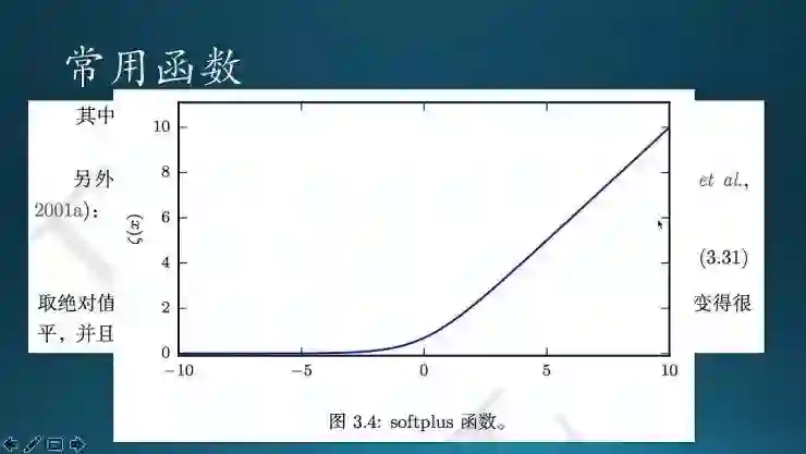 还有一个softplus,它是softmax的一种弱化;softmax从右往左下降会直接到0,在0的位置有一个突变,然后继续走;0这个点的左导数和右导数是不一样的,左导数是0,右导数是1,所以0这个点上的导数是不存在的。怎么办呢?为了数学上面好看,而且求导方便,那就把它变成softplus,在0这个点做变换之后就整个平滑起来,每个点的都是可导的。实际上在书里面也提到一点,平时其实深度网络DNN里面会经常用到ReLU,ReLU里就是softmax。softmax是ReLU的一种推广。ReLU里0点也是不可导的,就有一些规则的方法,就是如果到了这个点的话,他会给要么是0,要么是1,视具体情况而论。