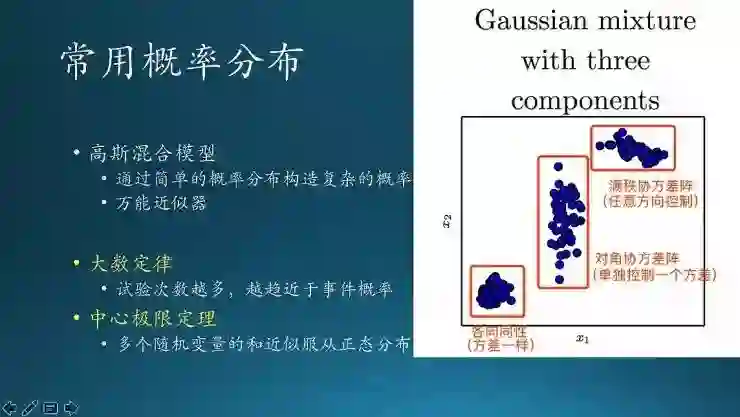 书里有个高斯分布分布,就是说刚才提到的分布都比较简单,我们能不能把它们整合起来,设计我想要的分布。这就用到高斯混合模型,这个图里面他构造了三种概率分布: