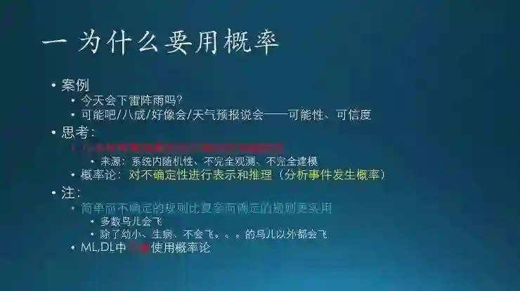 这节课会讲到一些基本概念,常用的分布,频率学派和贝叶斯学派的差别,还有贝叶斯规则,概率图,最后是信息论。这里第四条可能很多人可能头一回见到,学了那么多概率,连这个都不知道,那你的概率真的白学了,真这样,不开玩笑。不过,老实说我也是前几年才知道这个学派的差别,因为浙大三版教材上就没提到这些,好像就提到一点,频率学派就是古典概率,没有什么其他的,这也是现行教材的缺陷。