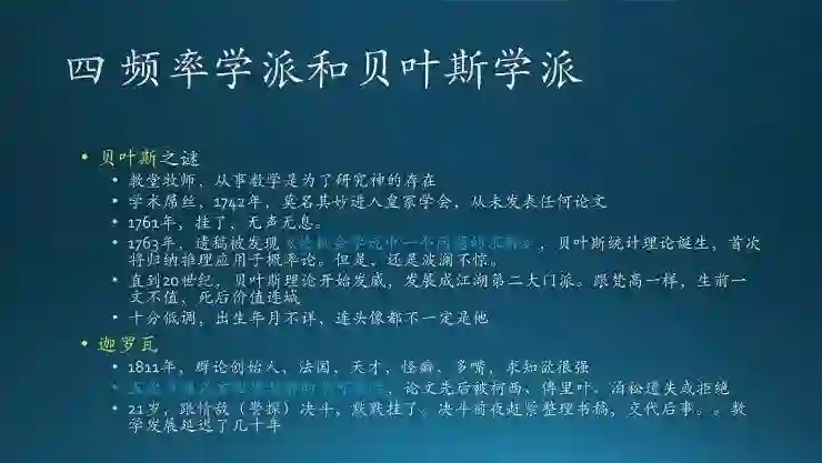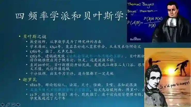 频率学派和贝叶斯学派。先讲讲贝叶斯这个人,他刚开始只是一个牧师,就是一个神职人员,滑稽的是,他做数学研究是为了研究神的存在;这个跟牛顿有点像,不过牛顿前期是不怎么研究,到老了研究上帝,最后没什么成果。贝叶斯是一个彻头彻尾的学术屌丝,在1742年就加入了皇家学会;当时也是有牛人给推荐了,他没有发表过任何论文,不知道怎么的就进去了;后来也挺凄惨,到1761年死了也没什么消息。1763年,他的遗作被人发现「论机会学说中一个问题的求解」,贝叶斯理论就从此诞生。