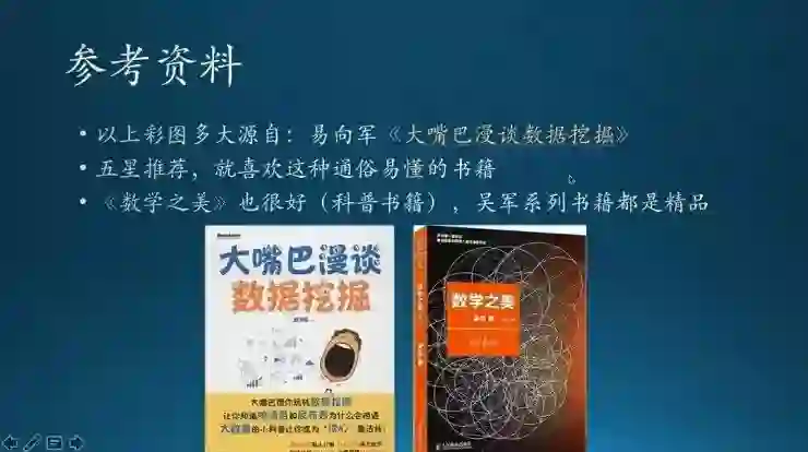 刚才PPT里面讲的大致的内容,图都是来自于「大嘴巴漫谈数据挖掘」这本书,朱向军的,这本书全部用图的方式去解释,非常好;还有「数学之美」和一些概念。