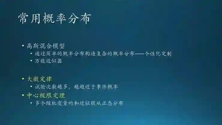 常用的概率分布,均匀、伯努利;范畴分布里面就不再是一个值,而是多个值,实验一次有多种结果,相当于扔的是色子,而前面扔的是硬币,那么硬笔只有两种取值;还有高斯分布,也叫正态分布。
