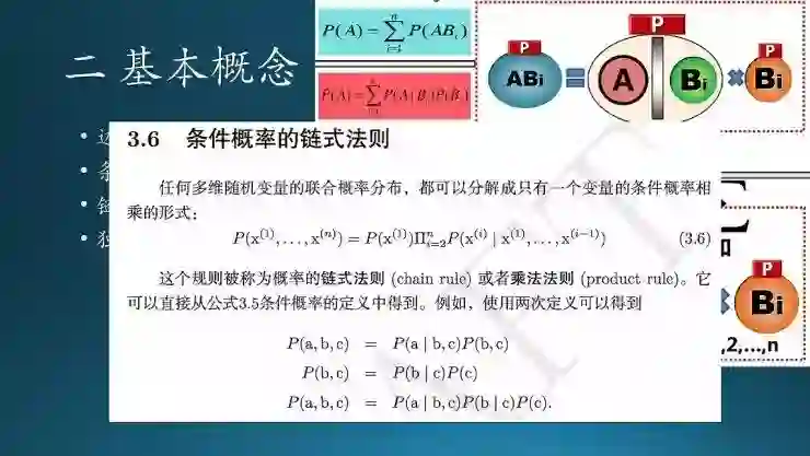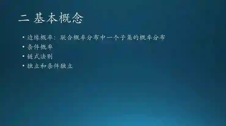 介绍几个概念。边缘概率是,如果联合分布涉及到x、y两个事件,那么固定x看它的平均分布,这叫边缘概率。条件概率是在一个事件发生的时候,另外一个事件的概率分布。