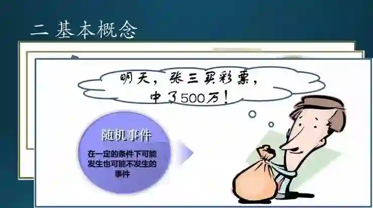 事件有几种分类。必然事件,太阳从东边升起西边落下是必然的;不可能事件,1+1不可能不等于2(这个不要钻牛角尖,这方面的段子很多,千万别跟我说陈景润证明1+1不等于2,我跟你急);买彩票中了五百万,这个概率是非常小的,即小概率事件。小概率怎么度量呢?就是正态分布里面三倍标准差以外,跟那个μ±3δ相关。