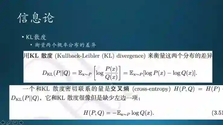 这里还有一个KL散度,基本上是衡量两个概率分布的差异。这个公式也很复杂,你们自己去琢磨,必须要看,看一遍然后才有直观的理解。现在讲也讲不清楚。(注:信息论也可以形象起来,参考:colah's blog,Visual Information Theory)