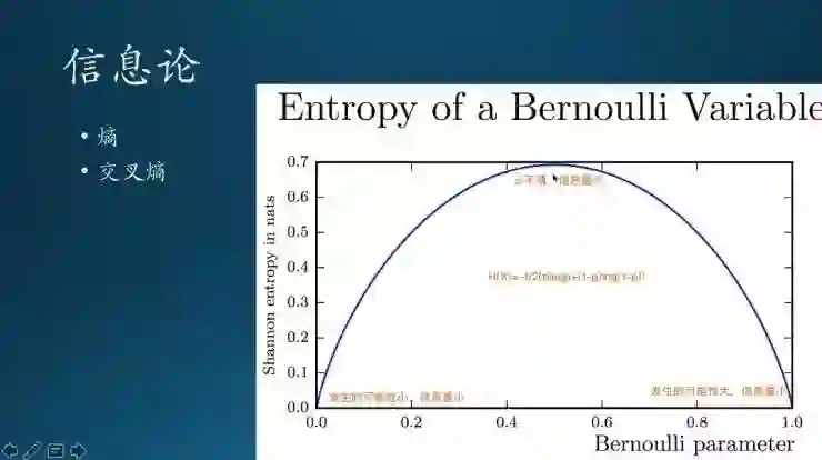 这里有一个交叉熵,也是重点提到的概念。这是衡量事件发生的概率,像左侧靠近零,说明这个事件发生的可能性很小,那么它对应的信息量较少;然后到中间0.5的地方,比如说扔硬币有两种结果,两种结果0.5基本上靠猜,完全随机了;对于这样分不清到底结果是什么样的,对应的信息量最大的;类似的到另外一个极端,就是这个事件确定是可以发生的,可能性很大的,那信息量也小。