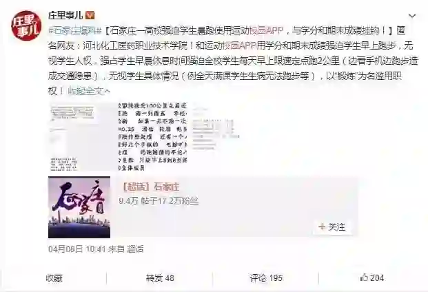 4月8日,微博博主“庄里事儿”发文称接到匿名网友爆料,河北化工医药职业技术学院强迫学生使用运动校园App进行晨跑,且与学分和期末成绩挂钩。爆料内容显示,每天早上限速定点跑2公里,学生需边跑边看App,无视学生具体情况如满课和生病等,一天不跑一次扣0.25分,周一到周五学校会检测。