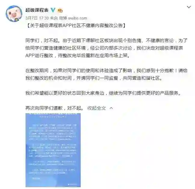 今年3月7日,超级课程表App在微博上发布公告称,由于App中下课聊社区板块出现个别色情、不健康的言论,经公司内部讨论决定对超级课程表App进行整改下架,整改完毕后重新上架。
