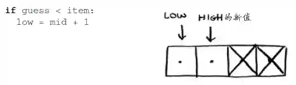 如果用二分查找的方式,二分查找的运行时间为对数时间(或 log 时间)。100 个数字,最多要猜 7 次;40 亿个数字,最多只需猜 32 次。厉害吧?看看是不是节省了很多时间呢?