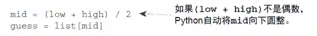 简单查找逐个地猜测数字,上面 100 个数字,最多需要猜 100 次。如果从 40 亿个数字中猜呢?最多需要猜 40 亿次。最多需要猜测的次数与列表长度相同,这被称为线性时间(linear time)。