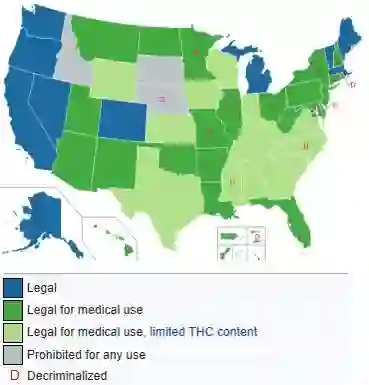 然而各州法律对大麻的合法性规定有所不同,目前认为药用大麻合法的州有33个,在药用合法的基础上还将娱乐大麻合法化的州有10个(美国共有50个州及一个特区)。