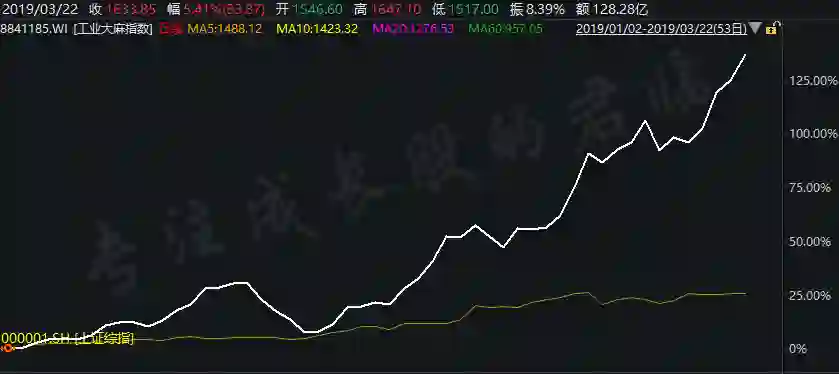 这个板块年初至今十分火爆,由顺灏股份、龙津药业及诚志股份等12只工业大麻相关股票组成的“工业大麻指数”,涨幅136.21%。同期上证综指涨幅24.47%,轻松碾压大盘。