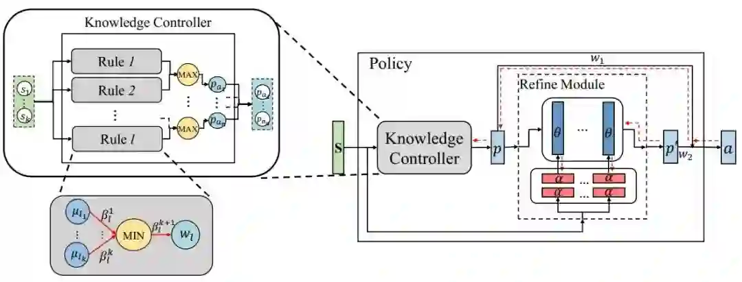 人类在面对新任务时,能够自然地利用从之前任务中获得的先验知识指导其之后的学习过程。这样的先验知识未必是与当前任务完全匹配的,很可能是次优的、模糊的,但是仍然能够大大加速人类的学习过程。因此,在强化学习过程中利用人类提供的先验知识直观上能够加速其学习过程。在序列决策问题中,利用人类知识的一系列重要工作是模仿学习,模仿学习需要利用专家的示教数据重建期望策略。而示教数据作为人类知识在某个任务下的具体体现,是low level的知识,我们期望能够利用high level的知识,例如人类的常识知识,在未见过的任务中且没有示教数据可供使用的情况下指导智能体的学习。受此启发,我们提出了一种新颖的知识引导策略网络(Knowledge Guide Policy Network,KoGuN),将人类的先验知识结合到深度强化学习的学习过程中,其框架如图5所示。我们引入了可学习的知识控制器(Knowledge Controller)编码人类知识,其中包含若干条模糊规则。模糊规则适用于基于不确定的、不精确的知识进行推理,这与人类提供的具有非精确性的先验知识相契合。我们使用的模糊规则的形式如下: