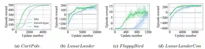 同时,我们设计了知识精化模块(Refine Module)对次优先验进行修正。我们提出的知识引导策略网络能够与现有的基于策略的强化学习算法结合,进行端到端的训练。实验结果显示,我们的方法在离散和连续动作空间任务中均能够提高智能体的学习效率: