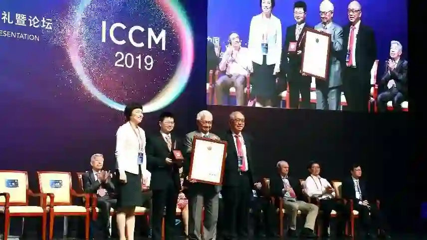 ICCM 2019现场,丘成桐为ICCM数学奖金奖得主颁奖 图源:https://www.sohu.com/a/319576167_105067