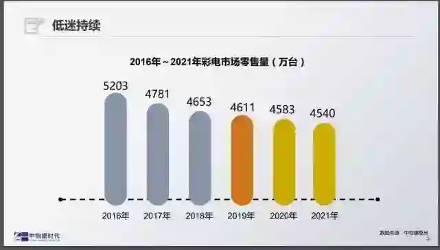 乐视电视业绩辉煌的2016年,正是彩电行业的一个拐点。从2016年开始,彩电行业销量开始下滑,进入低迷时期。根据中怡康的统计和预测,2017年中国市场彩电零售量同比下滑8.1%,是过去15年下降幅度最大的一年。同时,2016年到2021年,彩电市场零售量将会持续下滑。