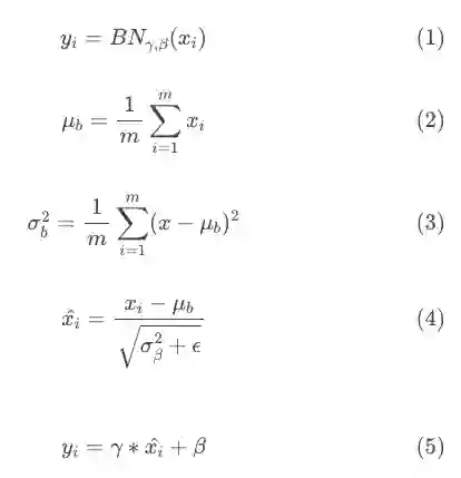 等式5是关键部分。γ和β是所谓的批归一化层的参数,等式5的输出均值为β,标准差为γ。从效果上说,批归一化层有助于优化算法控制网络层输出的均值和方差。