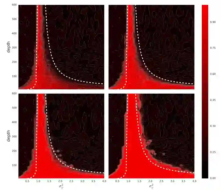 近期有研究使用平均场理论(mean field theory)来构建对使用随机参数的神经网络的理论理解(Poole et al., 2016; Schoenholz et al., 2017; Yang & Schoenholz, 2017; Schoenholz et al., 2017; Karakida et al., 2018; Hayou et al., 2018; Hanin & Rolnick, 2018; Yang & Schoenholz, 2018)。这些研究通过探索哪些信号可以在初始化阶段传播来揭示网络的最大深度,并通过实验验证:当信号可以遍历网络时,网络可得到准确训练。在全连接层中,该理论还预测初始化超参数空间中存在从有序到混乱阶段的转变(相变/phase transition)。对于在阶段分割的关键线上进行初始化的网络,如果信号可以传播,那么任意深度的网络都可以被训练。