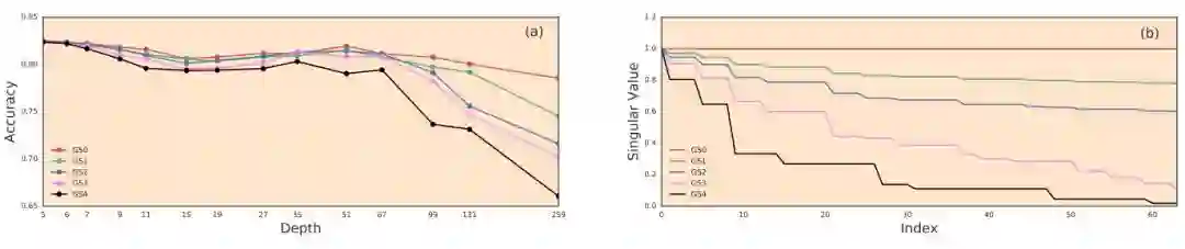 图 4. 随深度变化的测试性能与广义平均算子(A_v*)的奇异值分布(SVD)相关。(a)在关键线上的初始化,研究者检查了使用不同深度和不同非均匀方差向量的高斯初始化的 CNN 的测试准确率。研究者将来自 delta 函数(红色)的方差向量改变为均匀分布的方差向量(黑色)。从深度为 35 开始,测试准确率曲线也从红色变成了黑色。(b)所选方差向量的(A_v*)SVD。x 轴表示奇异值的索引,每个方差向量共有 64 个奇异值(每个有 64 个副本)。