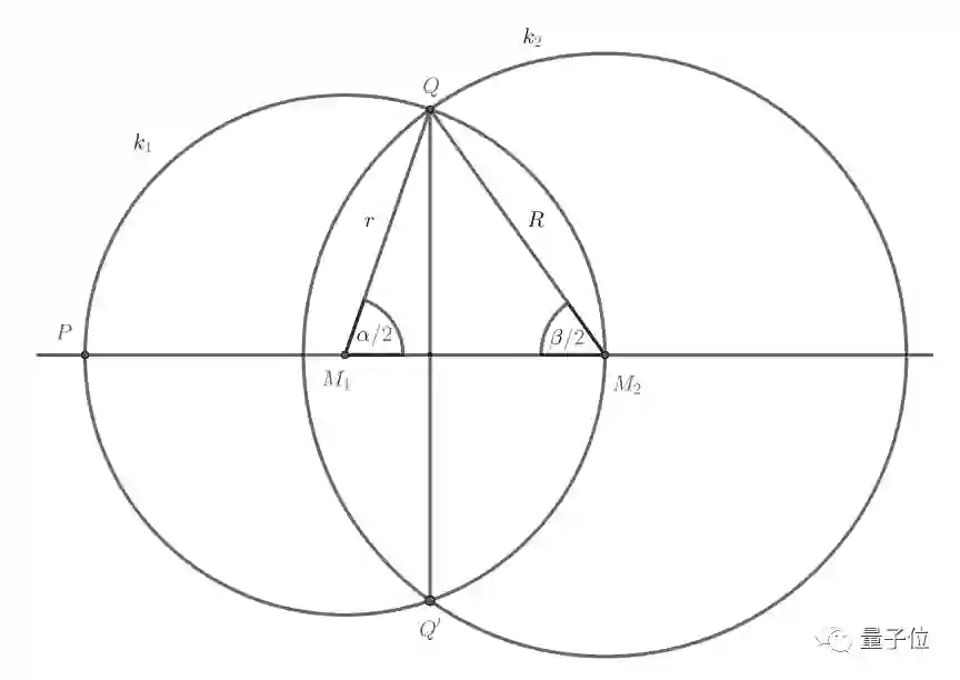 根据Ullisch的思路,他以两个圆的圆心与其中一个交点相连,组成了一个三角形,如下图所示。