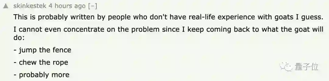 我认为这个问题,是没有山羊相关的经验的人提出的。因为我一想到山羊,就会想到它们在拼命跳篱笆、嚼绳子……这让我没办法专心解决这个问题。