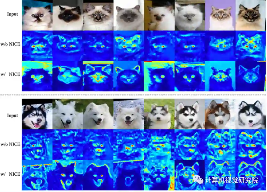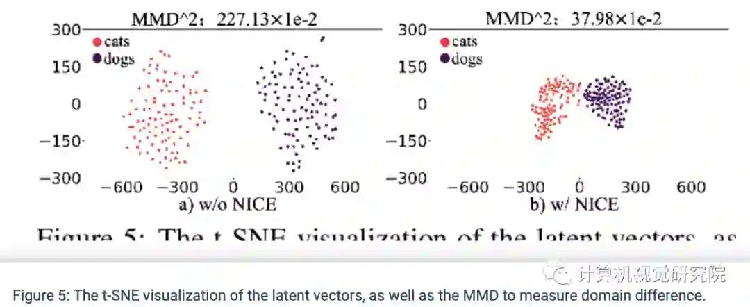 通过t-SNE可视化隐层编码,并利用Maximum Mean Discrepancy(MMD)以计算隐层空间两个编码分布的差异。有趣的是,通过NICE的训练,两个域的隐层空间分布变得更加聚集和紧密,但彼此依然可分。这种现象解释了为什么NICE-GAN表现出色。基于共享隐层空间假设构建的NICE-GAN,通过缩短低维隐层空间中域之间的转换路径,可能会促进高维图像空间的域的转换。同时进一步支持了一个重要观点:对比由通过最大似然训练的编码器网络学习的特征,由经过判别训练的网络学习到的特征往往更具表现力,也更适合推理。在NICE-GAN中,编码器也成为分布距离度量函数的一部分,而生成器只需要从隐层分布中提取循环一致性信息并拟合目标域分布。这种简单解耦的明确分工,有望引起人们对判别器实际作用的重新思考,它可能会刷新基于GAN的诸多任务的实现框架。