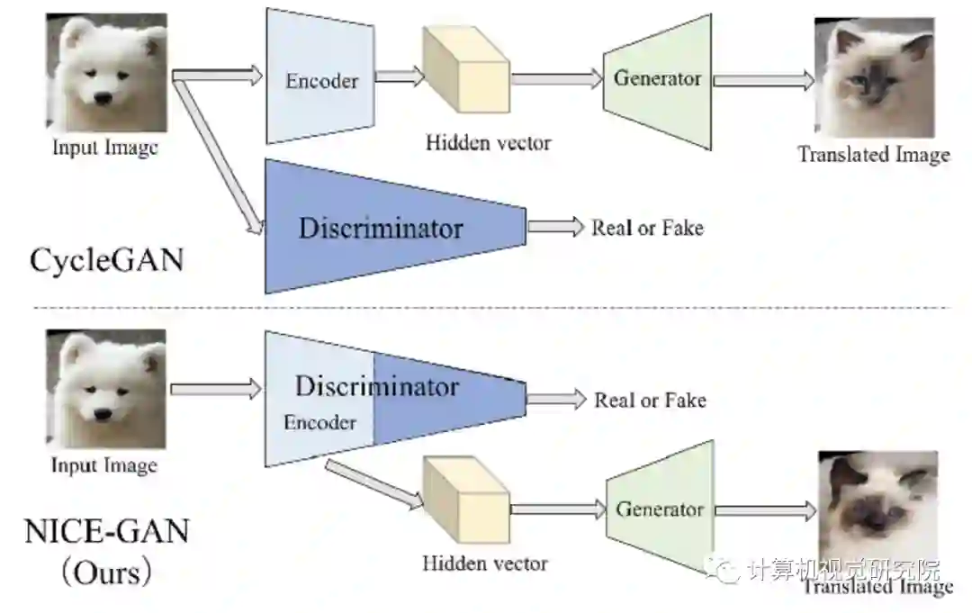 无监督图像到图像的转换是计算机视觉的核心问题。训练结束后,大多数当前的图像转换框架将丢弃判别器。本文通过重复使用判别器来对目标域的图像进行编码,提出NICE-GAN。与以前的方法相比,方法具有两个好处:首先,由于不需要独立的编码组件,因此结构更紧凑;其次,这种插入式编码器直接受对抗损失训练,如果应用了多尺度判别器,则其信息量更大,训练更有效。