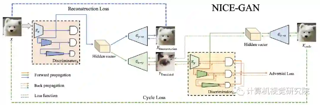 网络结构:NICE-GAN图形流程图的说明。在这里,我们只显示从X到Y(从狗到猫)的一个转换流。注意,我们应用了一种解耦的训练方式:当最小化对抗损失、重建损失和周期损失时编码器Ey是固定的,当最大化对抗损失时,它是训练的。
