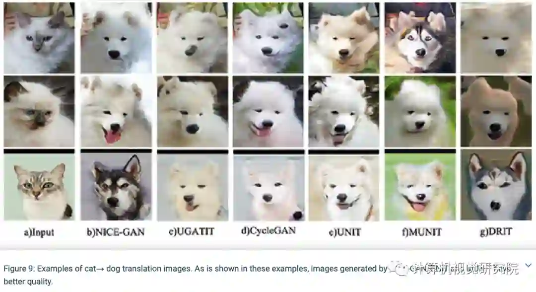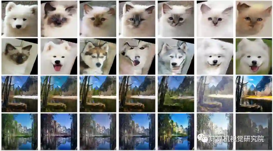 转换效果图。从上到下依次为:狗<—>猫,冬天<—>夏天,普通照片<—>梵高作品,斑马<—>综马