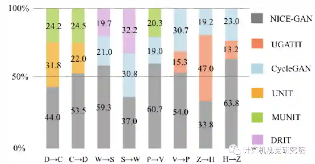 作者在四个流行的基准上进行的广泛实验证明,在FID,KID以及人类感知偏好等指标上,NICE-GAN的性能优于最新方法。此外,作者还进行了全面的消融研究,以验证每个组件的有效性。