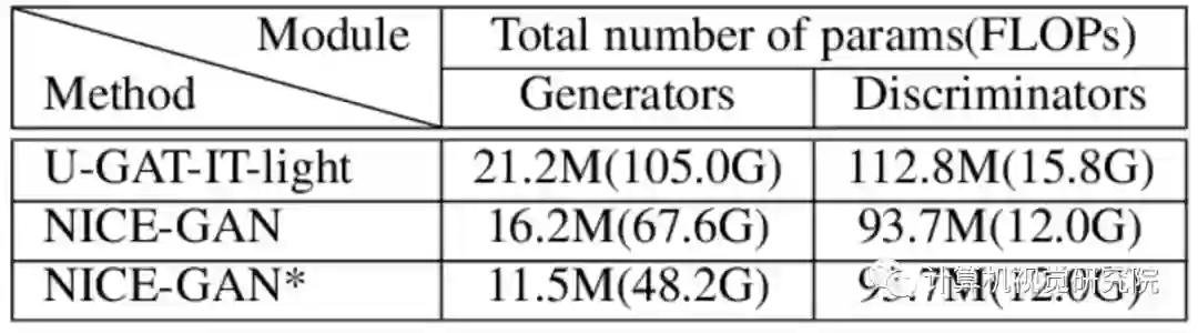 模型大小和浮点运算量。表明NICE-GAN体系结构更加紧凑,模型复杂度更低