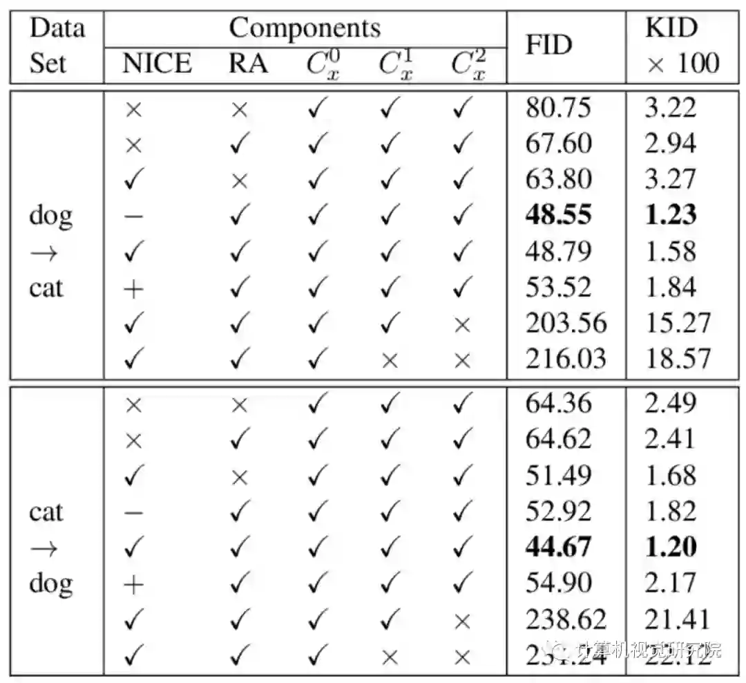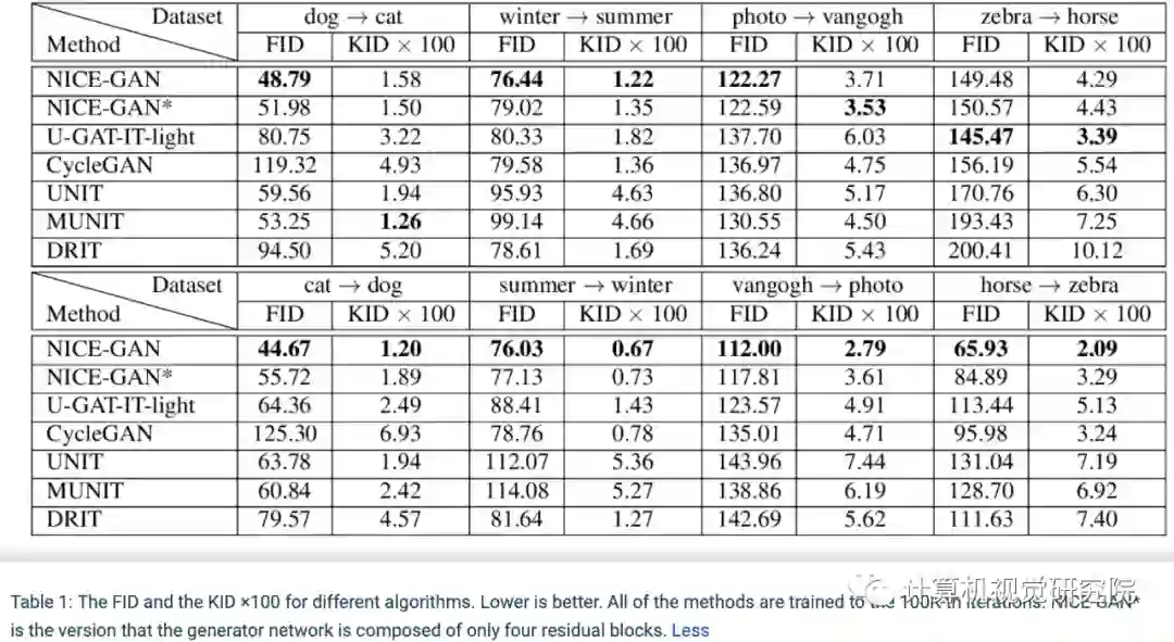 在四个流行的基准上的FID和KID指标。NICE-GAN的性能优于最新方法