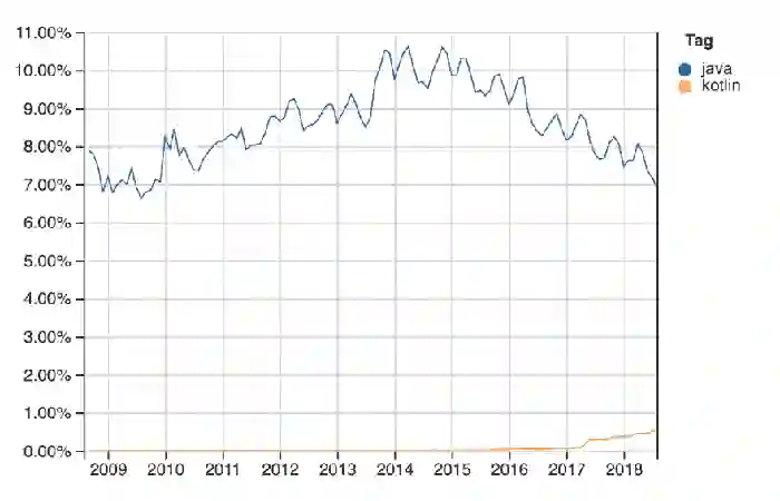 Stackoverflows上的趋势图显示Java从2015年以后走下坡路,而Kotlin开始上升。该图形中的Java趋势不断下降,Java很容易失去其作为一种非常流行的编程语言的地位。Java会逐渐趋于衰落?并且会有很多不同的语言取而代之吗?