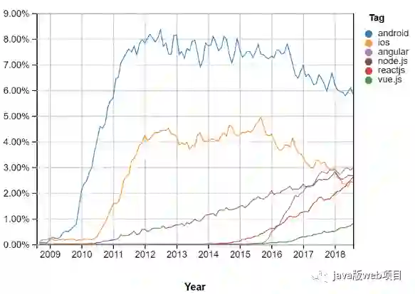 6. Stackoverflows这些图表的下降趋势实际上是由于人们的较低兴趣,或者只是答案已经存在且不再需要被问及。向上趋势肯定表明增长,但下降趋势......可能只是成熟和时间的标志,不一定是人气下降。