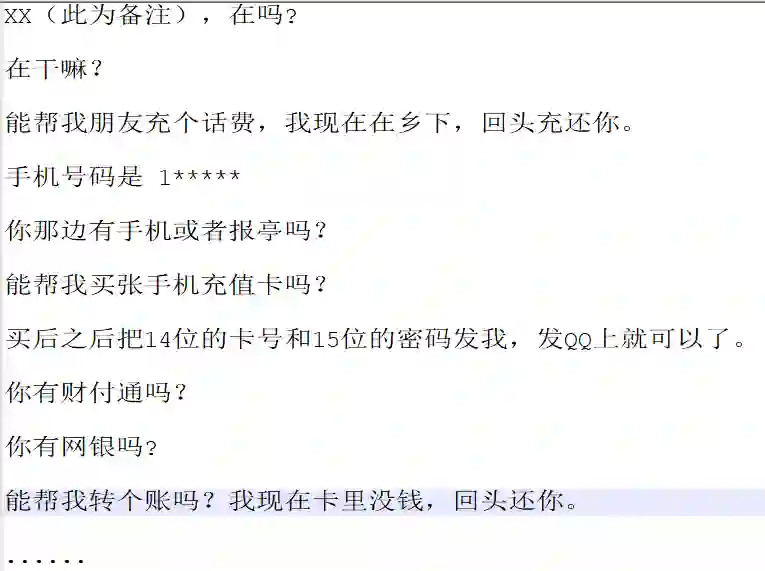 那时候网银不普及,QQ只有财付通,支付宝也很少人使用,还是现金支付的时代,所以QQ诈骗主要骗话费和手机充值卡,那时候手机号码还不用实名制。