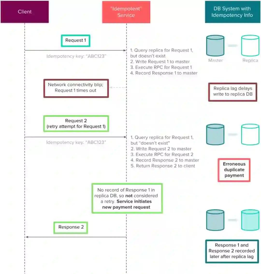 例如,假设支付服务将其幂等信息存储在从库中。客户端向支付服务提交付款请求,该请求最终成功,但客户端由于网络问题而未收到响应。虽然当前存储在服务主库中的响应最终将最终写入从库,但是,由于有同步延迟,客户端可能会进行重试,由于同步延迟,服务可能会错误地再次执行付款,从而导致重复付款。下面的例子说明了仅仅几秒钟的复制延迟可能会对Airbnb造成重大财务影响。