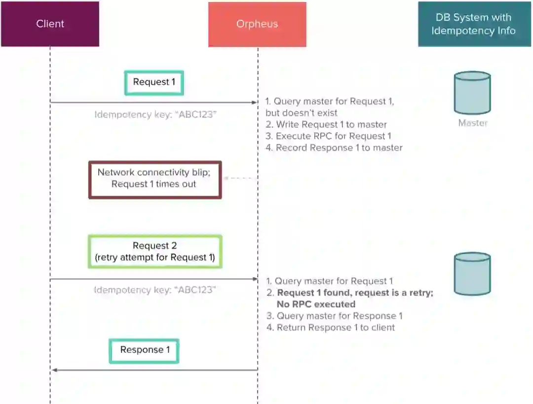 在使用Orpheus读取和写入幂等信息时,我们选择直接从主库执行操作。在分布式数据库系统中,在一致性和延迟之间存在权衡。由于我们无法容忍高延迟或读取未提交的数据,因此使用主库对我们来说是最有意义的。如果数据库系统没有配置为强一致性(我们的系统由MySQL支持),那么使用副本进行这些操作实际上可能会对幂等性产生不利影响。