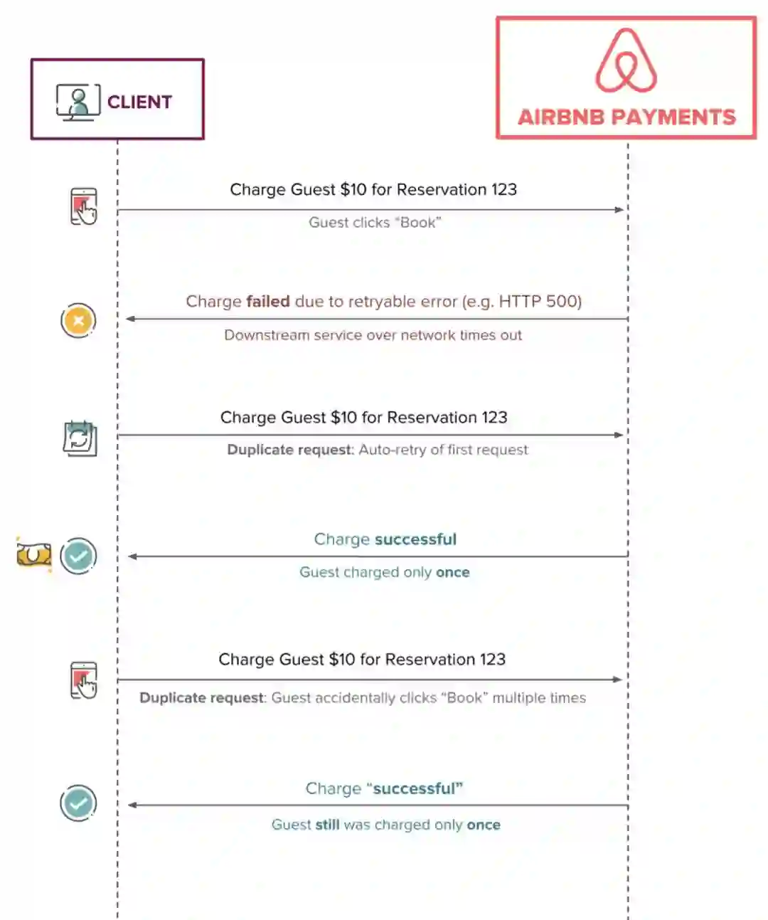 这种技术通常用于涉及资金流动的计费和支付系统,即支付请求必须完全处理一次(也称为“确切一次交付”)。重要的是,如果多次调用移动资金操作,系统最多只能移动一次资金。这对Airbnb Payments API至关重要,以避免多次支付。