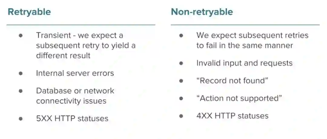通常,我们认为由网络和基础架构问题(5XX HTTP状态)导致的意外运行时异常是可重试的。我们希望这些错误是暂时的,我们希望稍后重试相同的请求最终会成功。