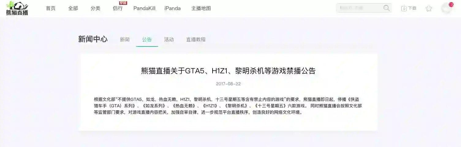 昨,熊猫 TV 发布了一条《关于 GTA5、H1Z1、黎明杀机等游戏禁播》的公告,明确指出将从即日起停播 GTA5、H1Z1 等六款游戏的直播。
