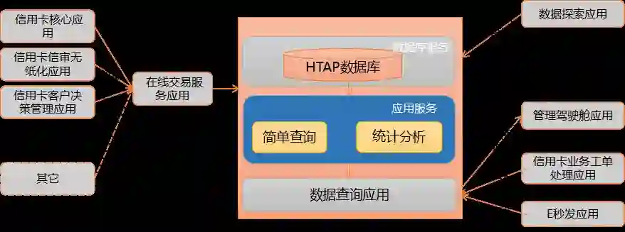 如图1所示,在某行信用卡中心项目中,将信用卡核心系统、信审无纸化系统、客户决策管理系统的数据通过数据同步工具与在线交易系统联通后,存入HTAP数据库,来同时支撑简单查询与统计分析。)