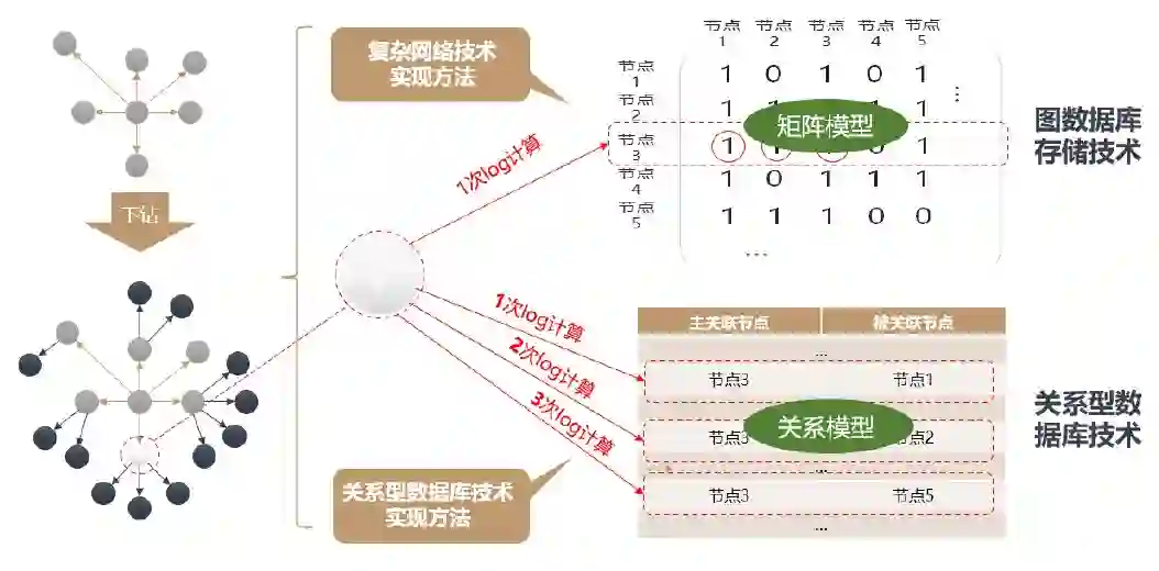 如图4所示,在查找与节点A相关的节点B的属性信息时,使用复杂网络只需进行一次log计算即可获取结果,而如果要通过传统数据库的关系型模型实现,则需要通过至少N-1次jion才能得到结果(N=A节点的一度关联个数),可以发现,如果进行大量此类结算,使用复杂网络的矩阵模型在同等配置情况下将会节省大量查询时间。
