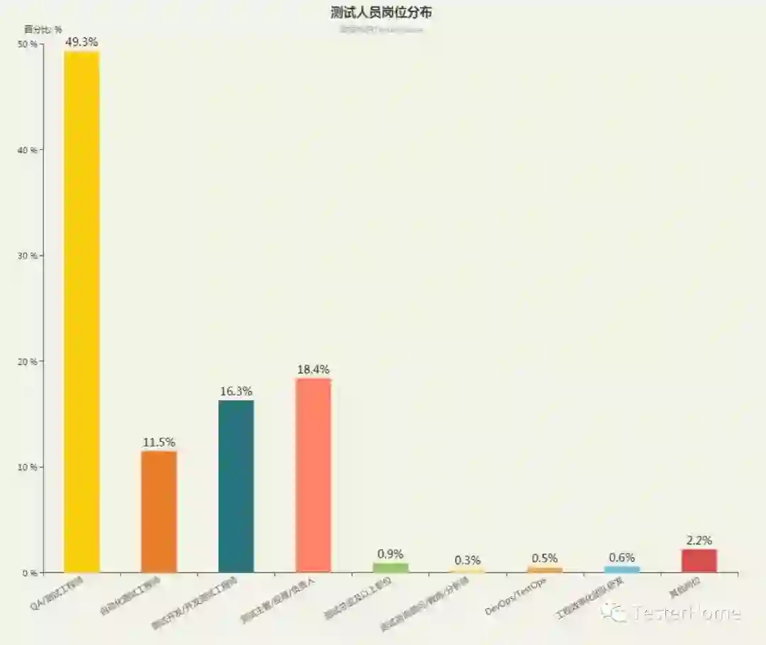 参与问卷的同学有一半是测试工程师岗位,测试开发和自动化测试两个岗位目前还处于待发展的阶段,社区的测试管理角色居然达到 18.4% 的比例,期望这些人能不断引领测 试行业的发展。
