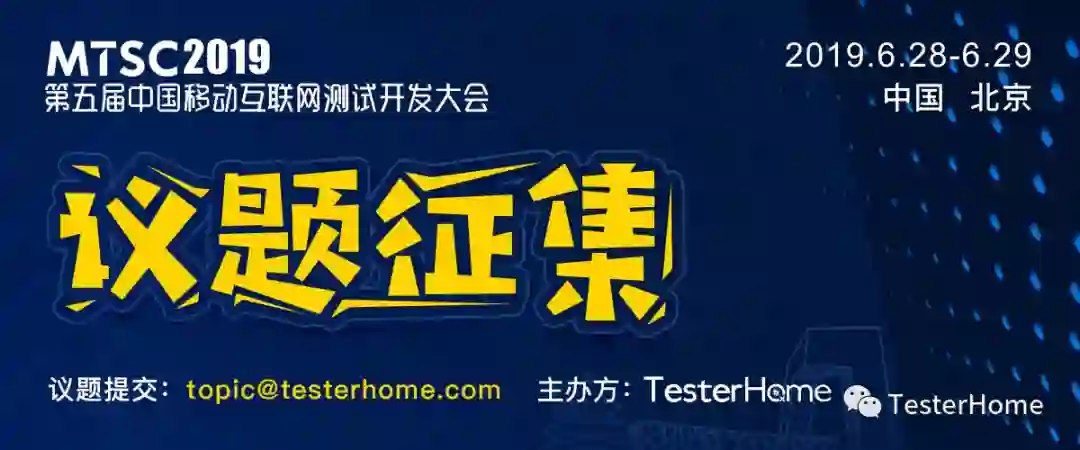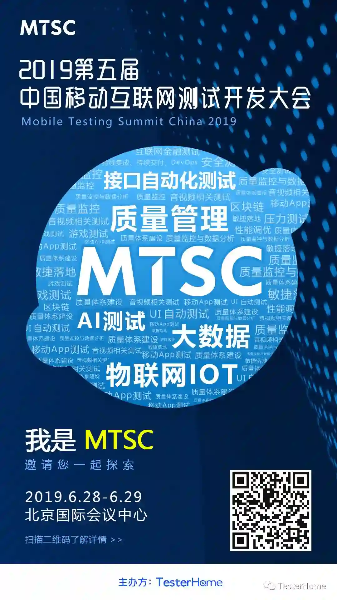 MTSC2019 第五届中国移动互联网测试开发大会正式启动,将于 2019 年 6 月 28~29 日在北京国际会议中心举行。本届大会联席主席为国家工信部的杨春晖主任、阿里优酷质量部负责人倪生华(玄黎)、腾讯 WeTest 负责人方亮、百度工程质量部负责人严飞、小米手机测试部总监周志彬、同济大学的朱少民教授、南京大学的陈振宇教授以及 TesterHome 社区联合创始人思寒。大会官网:https://testerhome.com/mtsc/2019