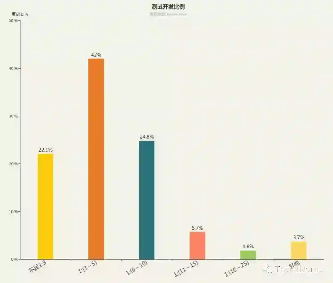 测试开发比例在 1:5 左右是比较理想的情况,不足 1:3 的项目团队的测试资源还是非常充沛的,而 1:10 及更大比例的测试团队,如果不考虑编制问题的话(如大量采用外包人员),则需要有先进的流程管理方式和健全的平台化工具来保障这种程度的人员配比,当然也可能是因为很多测试开发工程师算到了研发岗。