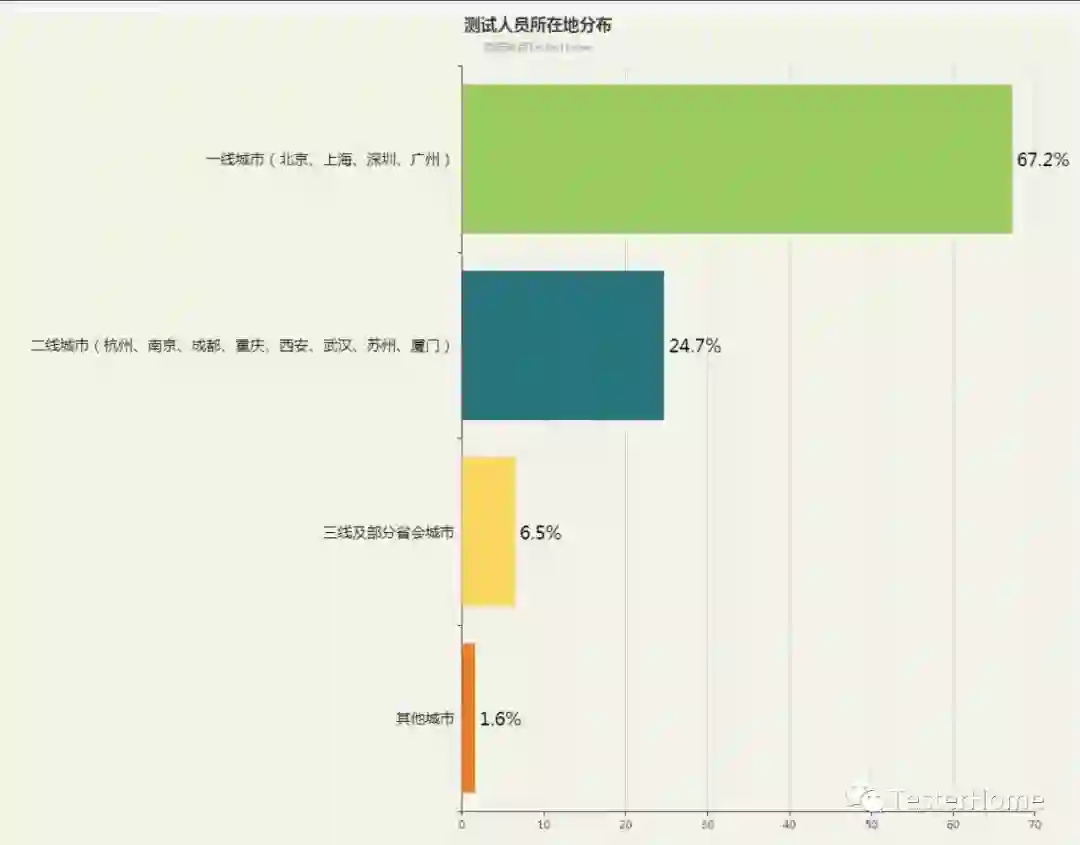 不出所料,一线城市占据了绝对的主导地位,测试行业作为 IT 行业的一部分,间接体现 行业公司的发展现状。分布在一线城市比例接近七成,这说明就业机会还是主要聚集在一线城市,二线城市虽然有个别城市发展迅速,但是整体来说,一线城市的公司数量和机会依然是大家青睐的地方,如果每年都可以完成这样的调研的话,或许可以看出一线城市和二线城市人才流动的趋势,帮助大家做一些决策。